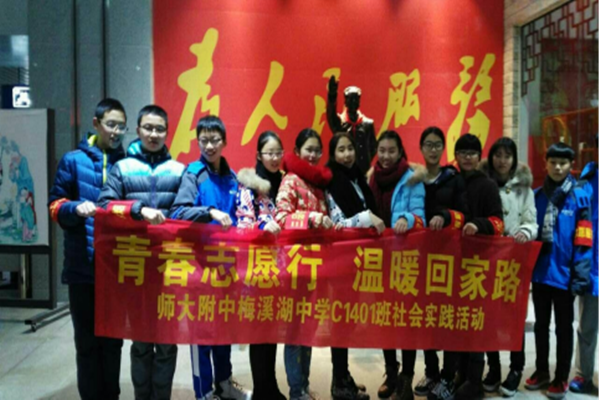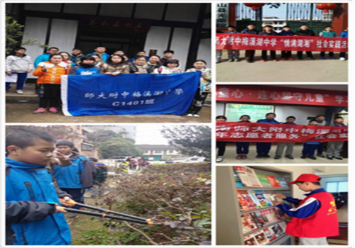 今年的冬天,是温暖的。而这个暖冬中的寒假,对于初1401班的学生来说,也是一个难忘又温暖的寒假!在师大梅溪湖校团委的引导下,初1401班的孩子们以自己的地区为小组,组织了一支支小分队,进行了形式多样的寒假实践!“温暖回乡人”、“关注留守儿童”、“扶组贫困家庭”、“环保小卫士”一项活动温暖着他人,也温暖着自己…….。 谁说“读书就不闻窗外事”,我们师大梅溪湖的学子读书同时不忘关注社会!就让我们跟随图片一起来感受一下实践小分队朝气蓬勃地爱心传递的步伐吧!