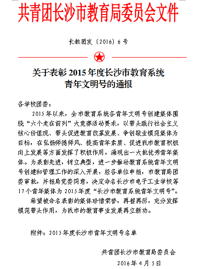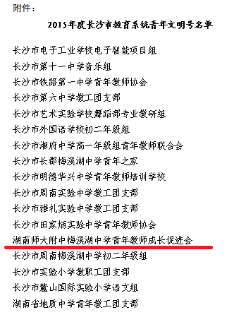 喜报:我校青年教师成长促进会荣获“长沙市教育系统青年文明号”称号 来源:团委 发布时间:2016-04-29 16:04:25 浏览次数: 次 【字体:小 大】 为表彰先进,树立典型,进一步推动教育系统青年文明号创建和管理工作的深入开展,经我校申报,市教育局团委审批,并报局党委同意,我校青年教师成长促进会被授予“长沙市教育系统青年文明号”称号。 分享到: 【打印正文】