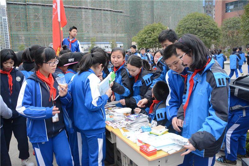 3月3日春风送暖,恰值“学雷锋爱心义卖”活动开展,难怪校园里热闹非凡呢!放眼望去,汩汩涌动的漉泉旁,已被各班卖场挤得水泄不通。那琳琅满目的物品叫人眼花缭乱: 自制小玩意、特色工艺品、精美明信片、书画作品、名著杂志、花艺装饰、香辣美食……好玩的好看的好吃的,可谓应有尽有。伴随着泠泠的泉水声,孩子们此起彼伏的吆喝也不绝于耳: “卖明信片喽,教师祝福哟,逢考必过!逢考必过!” “来看看,来瞧瞧,买二送一,买二送一!”;“走过路过,不要错过,机不可失,时不再来!”这还不够,为了拉拢看客,孩子们创意无限,各显神通。有摆上音响大胆献唱引人驻足的,有精心扮成仙女吸人眼球的,有自制寿司果汁诱人味蕾的……这些别出心裁的招数,引无数英雄竞折包!好奇的孩子们扭动着肢体,灵活地在缝隙中钻来钻去,东瞧瞧,西看看,这选一选,那挑一挑……看到越积越厚的爱心款,班主任与孩子们脸上既流露出自豪的神情,也洋溢着幸福的笑容,一个个更加卖力地吆喝起来,各班彩旗亦随风飘舞起来,仿佛也在为大家鼓劲呐喊……这热闹壮观的场面吸引了楼上学子观望,看到密密麻麻的人群涌动如潮,也有忍不住趁下课跑来凑热闹的……好一派青春飞扬,热闹活泼的景象!享受着迎面而来的和风,呼吸着清新的空气,不禁让人赞叹,师梅校园春意闹,爱心义卖热情高!