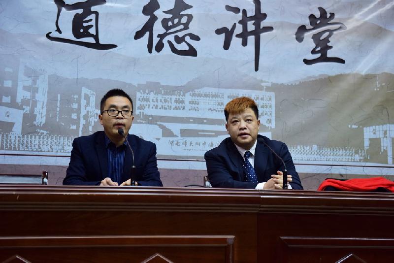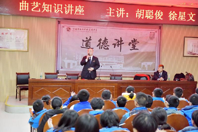 12月7日下午,我校第二届校园文化艺术节曲艺知识讲座在教学楼三楼道德讲堂举行。湖南省群众艺术馆、湖南省艺术家协会著名青年相声演员胡聪俊、徐星文受邀来校讲学。我校高一年全体师生参加此次活动。