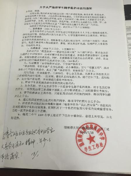 首先,学生工作处主任胡田超进行了专题广播讲话,宣传净化校园环境,杜绝乱丢垃圾的不良习气,并作了相关具体安排。各班利用班会课学习了“拒绝乱丢垃圾,营造干净舒适的学习环境”的倡议书。同学们还一同在倡议书上签名承诺,拒绝乱丢垃圾。随后,学工处还开展了文明监督员检查清扫活动。校爱卫队、卫生部秉着抵制乱丢乱扔不文明行为的职责,呼吁全校师生共同去发现并举报乱丢乱扔不文明行为。