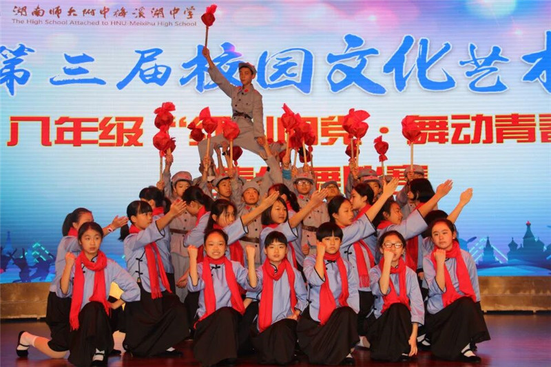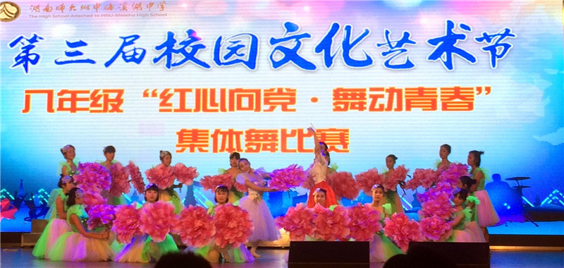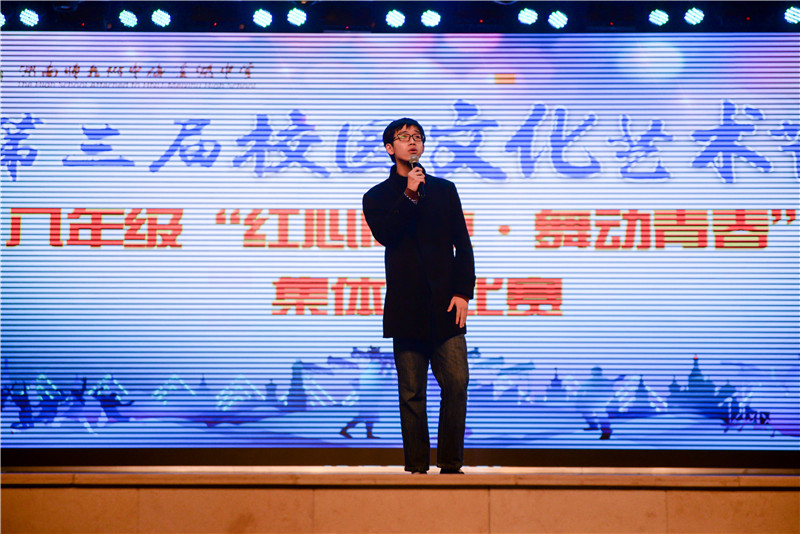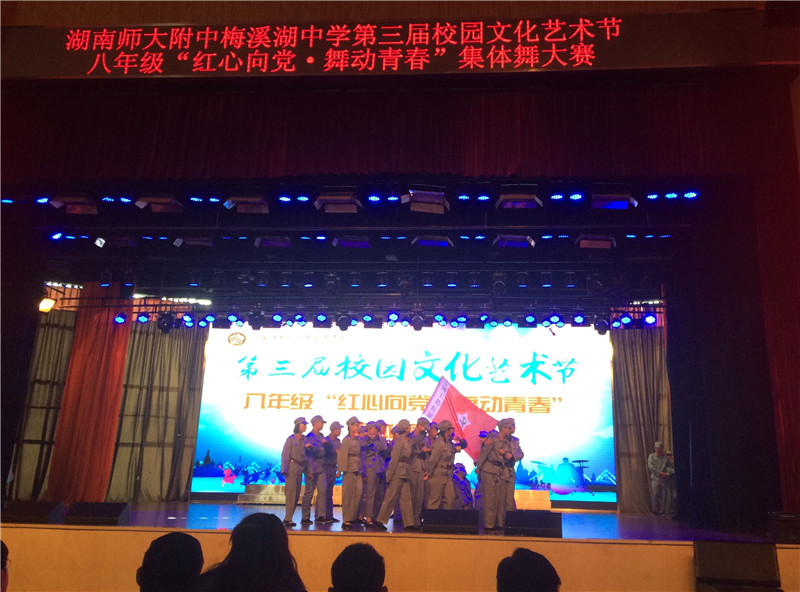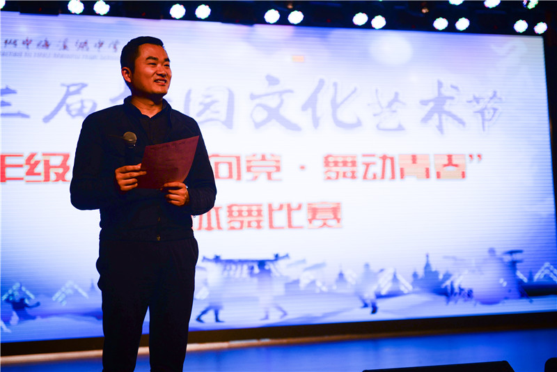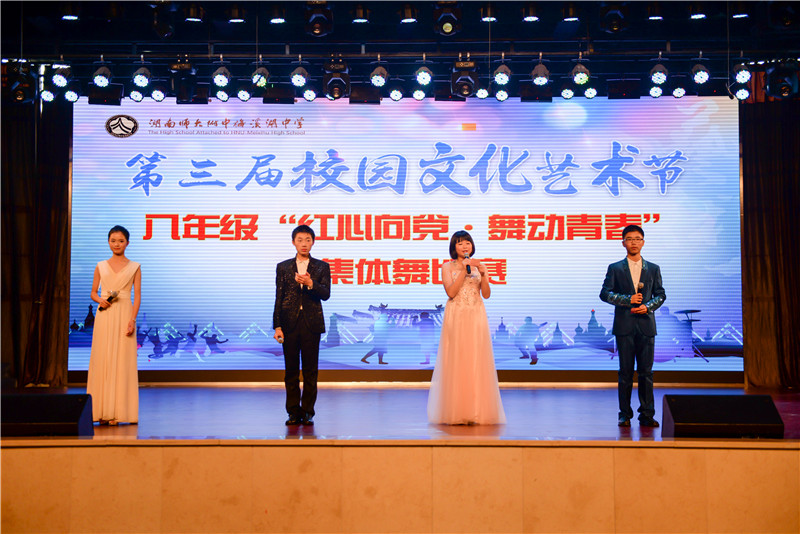 129日下午,我校第三届校园文化艺术节八年级“红心向党·舞动青春”集体舞比赛在体艺馆三楼隆重举行。校长彭荣宏,副校长张迪平、张志,党办主任张丽,学工处主任胡田超,保卫处主任兼教务处副主任胡海军,信息中心副主任兼学工处副主任黄坚等领导出席并观看了比赛。本次比赛由初1513班龙睿、初1510班杨振羽、初1508班陈瑞及初1503班李芃垚主持。
