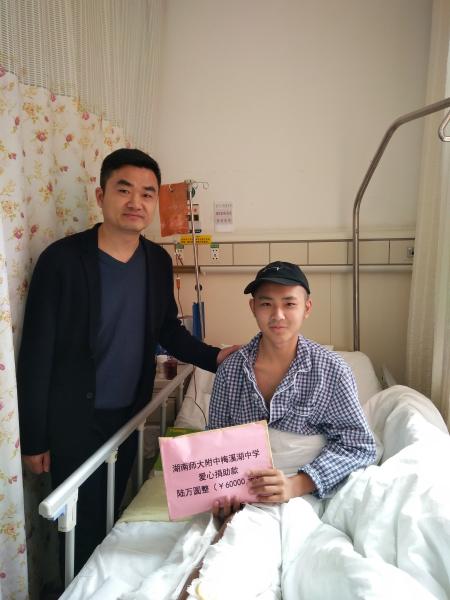 3月15日上午,校长晏荣贵带着全校师生的祝福和爱心捐款一行6人前往湘雅医院,探望慰问了我校罹患疾病的高1701班刘文骏同学,副校长张志、学工处主任王超、团委书记罗煦洁、教务处副主任兼高二年级组长唐亮、班主任朱敏一同前往。