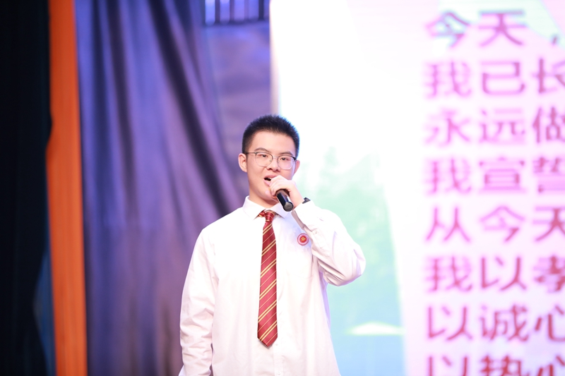 本次典礼由G1601班周楷程、G1602班彭子慧、G1602班肖沁桐和G1606班尹远等四位同学主持。由校舞蹈队一舞《绾纱》开场后,典礼在全体人员肃立齐声凑唱国歌中拉开了帷幕。师梅高三学生跟随党委书记钟慧莉学习宪法,在学生代表G1601班彭羿翰的领誓下一同作出十八岁成人的承诺,感受着十八岁成人需承担的更多职责。
