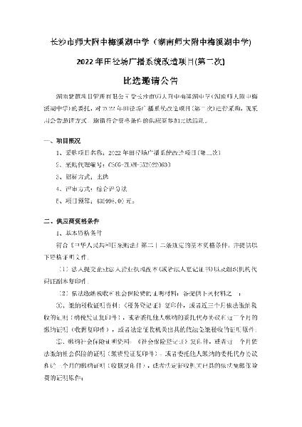 长沙市师大附中梅溪湖中学(聚彩彩票) 2022年田径场广播系统改造项目(第二次) 比选邀请公告 来源:总务处 发布时间:2022-07-11 12:03:44 浏览次数: 次 【字体:小 大】 分享到: 【打印正文】