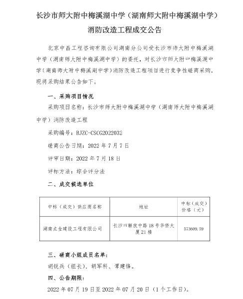 长沙市师大附中梅溪湖中学(聚彩彩票)消防改造工程成交公告