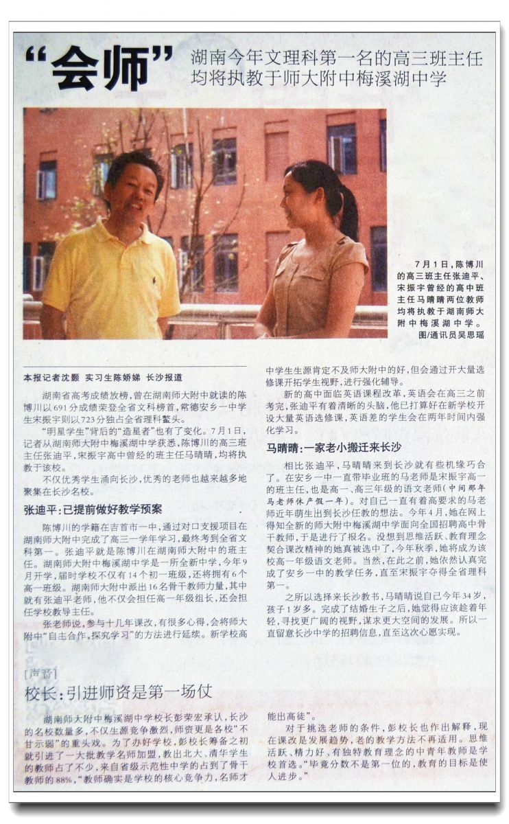 潇湘晨报:湖南今年文理科第一名的高三班主任均将执教于师大附中梅溪湖中学