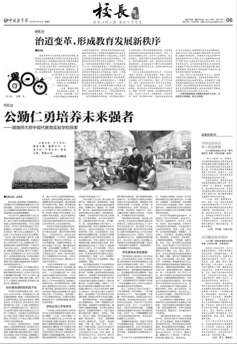 《中国教育报》刊文报道湖南师大附中现代教育实验学校探索 来源:附中本部 发布时间:2015-04-23 00:00:00 浏览次数: 次 【字体:小 大】 2015年4月16日,在我校110周年华诞来临之际,《中国教育报》校长周刊栏目以5000字的篇幅宣传湖南师大附中现代教育实验学校探索,现全文转载,以飨读者。 分享到: 【打印正文】