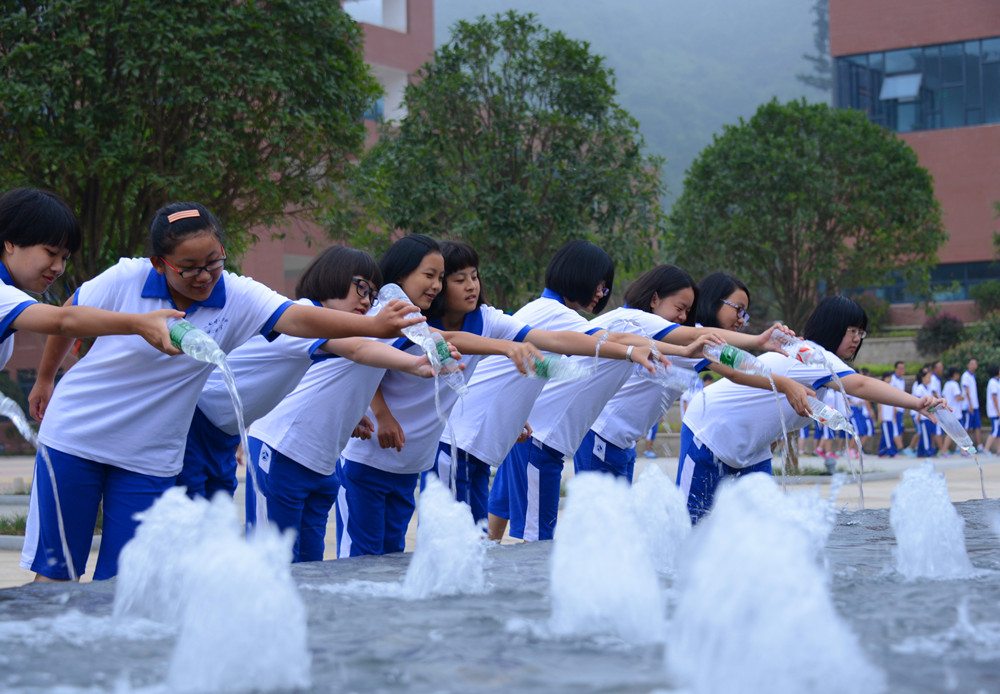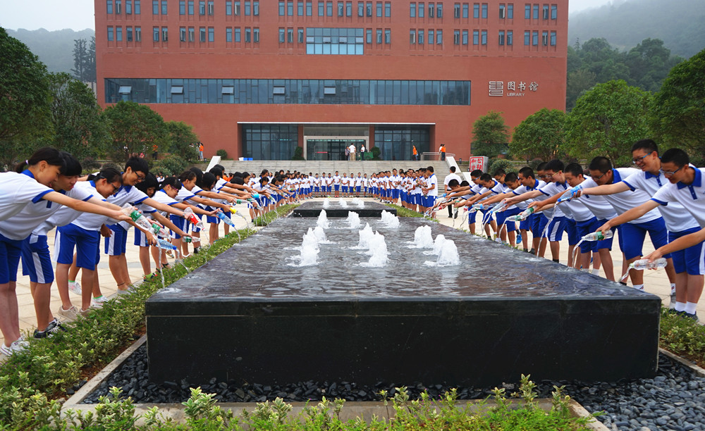 7时许,副校长莫晖宣布注水仪式开始。全校1300余名新生分班依次将暑假采集的家乡水注入我校漉泉。仪式结束后,学生们还纷纷秀出了自己携带的家乡石(上面刻有自己的姓名和美好祝福),准备将家乡石嵌入“痕墙”景点,希望几十年后回到母校也能看到自己成长的足迹。