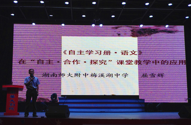 屈雪辉作“《自主学习册•语文》在‘自主•合作•探究’课堂教学中的应用”专题讲座。在一个多小时里,他先回顾了《自主学习册•语文》编撰的历程,介绍了其编撰的原则与方法。接着,他联系“自学案”、“探究案”、“训练案”,从教学内容与方法两个角度逐一作详细讲解。最后,他还与老师们分享了优质课堂的几条原则,即“课堂要高效,功夫在课前”、“从学生中来,到学生中去”、“教师是导演,学生是演员”。屈雪辉的讲座重实际,出实招,讲实效,其独特深湛的思考、睿智幽默的谈吐赢得了与会教师的阵阵掌声和笑声。