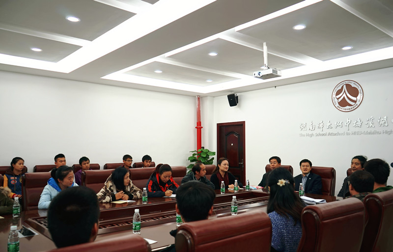11月19日上午,湖南师大体育学院赴我校实习队工作汇报会在图书馆四楼会议室举行。湖南师范大学体育学院副院长汤长发,教务处主任彭豪、团委书记王静、实习队指导老师黄文宾,我校校长彭荣宏、副校长莫晖、工会副主席谭伟出席汇报会。