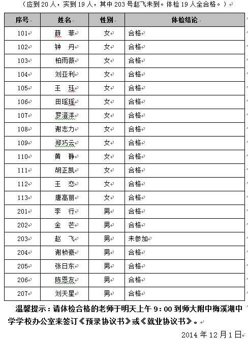2014年师大附中梅溪湖中学教师招聘体检结果