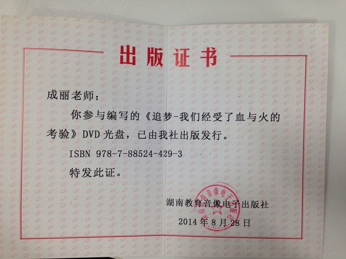 近日,我校历史组教师成丽参与编写的《追梦一一我们经受了血与火的考验》DVD光盘由湖南教育音像电子出版社出版发行。