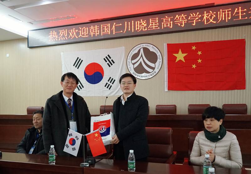 12月25日上午,韩国仁川晓星高等学校师生代表团一行来我校交流访问,学校在图书馆一楼会议室举行欢迎仪式。我校校长彭荣宏、党总支书记钟慧莉、副校长莫晖、副校长胡惠出席仪式。