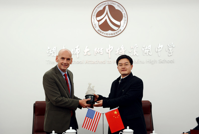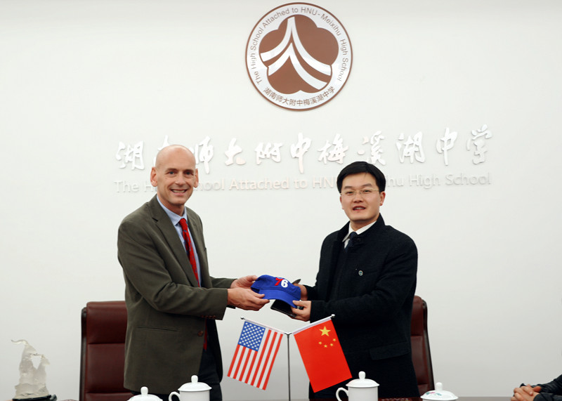 仪式前,Cary Anderson(卡里·安德森)一行参观了校园,并与我校学生展开了交流互动。
