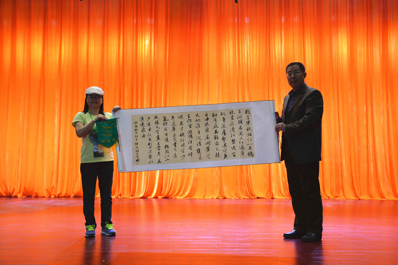 10时许,工会副主席谭伟在体艺馆三楼礼堂主持了隆重的欢迎仪式。副校长莫晖代表学校对客人的到来表示热烈的欢迎,并向这6所学校一一赠送了由我校青年教师、“教育因你而美”全国书画赛大奖获得者贺娟老师撰写的书法作品。