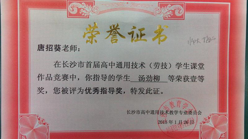 喜报:我校五位学生在长沙市首届通用技术(劳技)学生课堂作品竞赛中获得一等奖 来源:教务处 李莹 发布时间:2015-04-09 00:00:00 浏览次数: 次 【字体:小 大】 近日,喜讯传来,我校在长沙市首届通用技术(劳技)学生课堂作品竞赛中,有十二位同学获奖,其中有汤劲柳、余典、欧阳福邦、高超、杨蔚五位同学荣获一等奖,周洋、施乐、刘语薇三位同学荣获二等奖,唐招葵老师荣获“优秀指导奖”。在此,特向获奖学生和老师表示热烈的祝贺,向全校师生报喜! 分享到: 【打印正文】