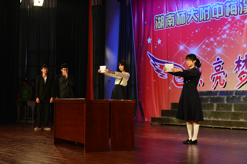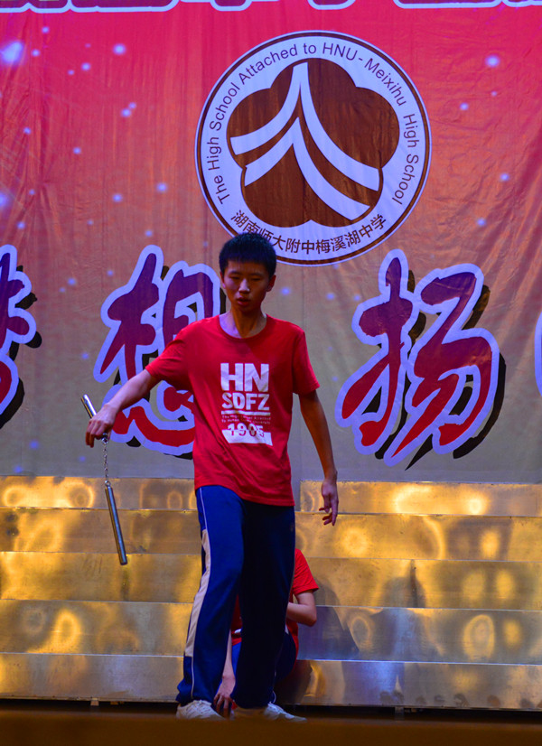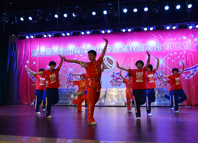 文艺汇演率先上演。第一个走上前台的是动漫社,随着最时髦动漫人物“大白”的出场,体艺馆里一片欢腾;音乐社带来的歌曲串烧《put your hands up》旋律优美,让人沉醉;英语社表演的话剧《Cinderella》再次让观众捧腹,掌声雷动;武术社的传统武术表演《少年,少年》刀剑你来我往,让人眼花缭乱;科技社发明的机器人画出了清晰的校徽,大家啧啧称奇;戏剧社为同学们带来的《桃花源里论三国》,台词富于时代气息,引发强烈共鸣;最后登场的是街舞社,《作one》激情四射,将舞蹈魅力发挥得淋漓尽致……