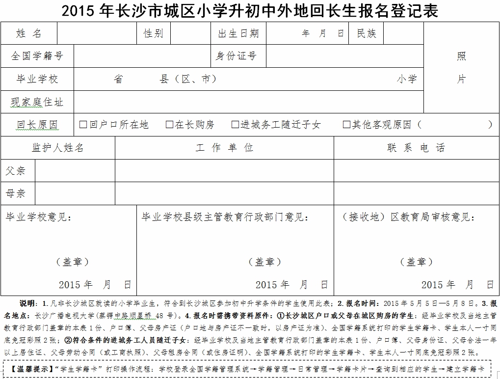 2015年长沙市城区小学升初中外地回长生报名登记表 来源: 发布时间:2015-04-22 00:00:00 浏览次数: 次 【字体:小 大】 附件:2015年长沙市城区小学升初中外地回长生报名登记表 分享到: 【打印正文】