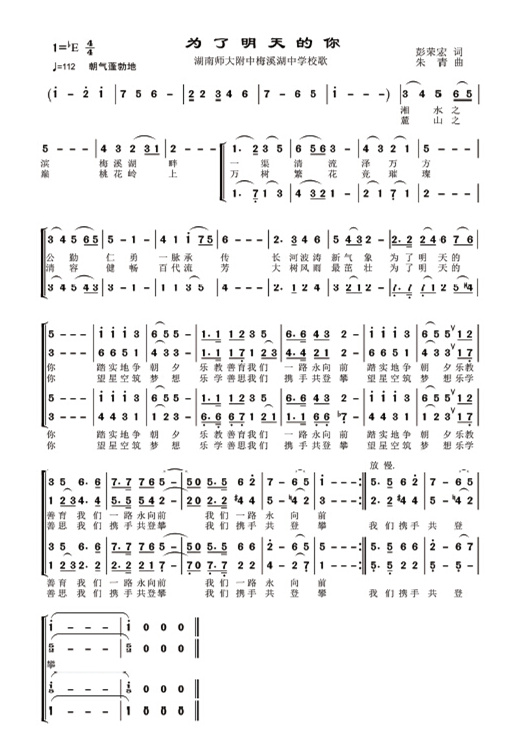 我校校歌正式发布 来源:校办公室 发布时间:2015-06-12 00:00:00 浏览次数: 次 【字体:小 大】 为了明天的你——聚彩彩票校歌 作词:彭荣宏 作曲:朱 青 湘水之滨,梅溪湖畔,一渠清流泽万方。公勤仁勇,一脉承传,长河波涛新气象。为了明天的你,踏实地,争朝夕,乐教善育,我们一路永向前。 麓山之巅,桃花岭上,万树繁花竞璀璨。清容健畅,百代流芳,大树风雨最茁壮。为了明天的你,望星空,筑梦想,乐学善思,我们携手共登攀。 分享到: 【打印正文】