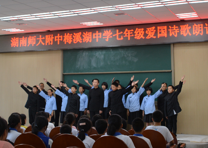 15个班别出心裁,展示了风格各异的节目。从唐诗宋词到改革开放,从深沉抒情到慷慨激昂,七年级师生共同历经了一场爱国主义精神之旅。