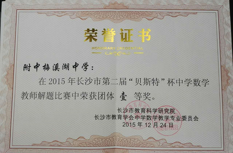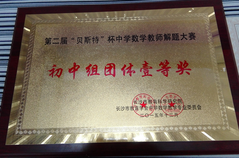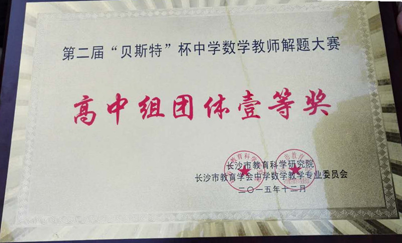 近日,喜讯传来,在湖南省、长沙市第二届“贝斯特”杯中学数学教师解题大赛中,我校数学组荣获长沙市比赛初中组和高中组团体一等奖。