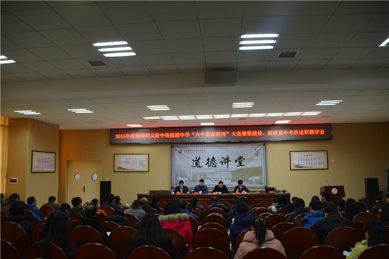 考核小组参加了在教学楼三楼道德讲堂召开的“2015年度‘六个走在前列’大竞赛暨绩效、廉政集中考核述职测评会议。我校校长彭荣宏,党总支书记钟慧莉,副校长胡惠、张迪平、张志,校长助理屈雪辉,中层干部,年级组长,支部书记,教研组长,民主党派代表,教师代表等共计六十七人参加了大会。会议由钟慧莉主持。