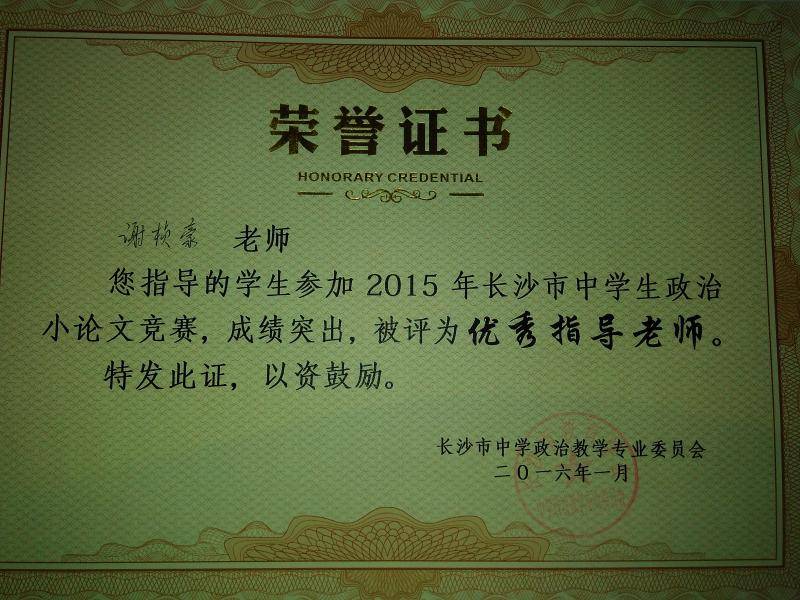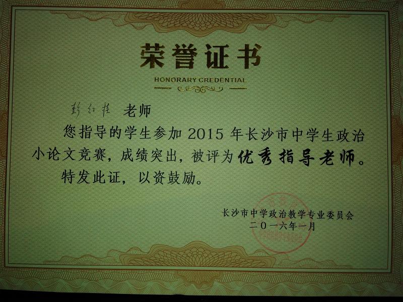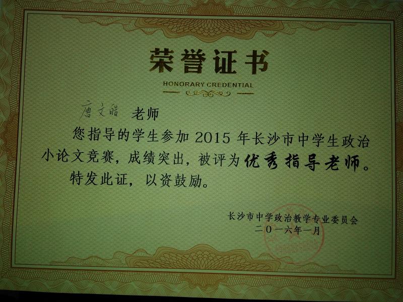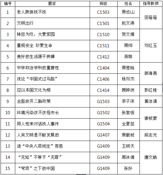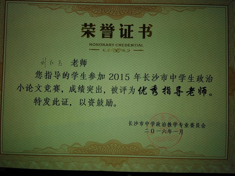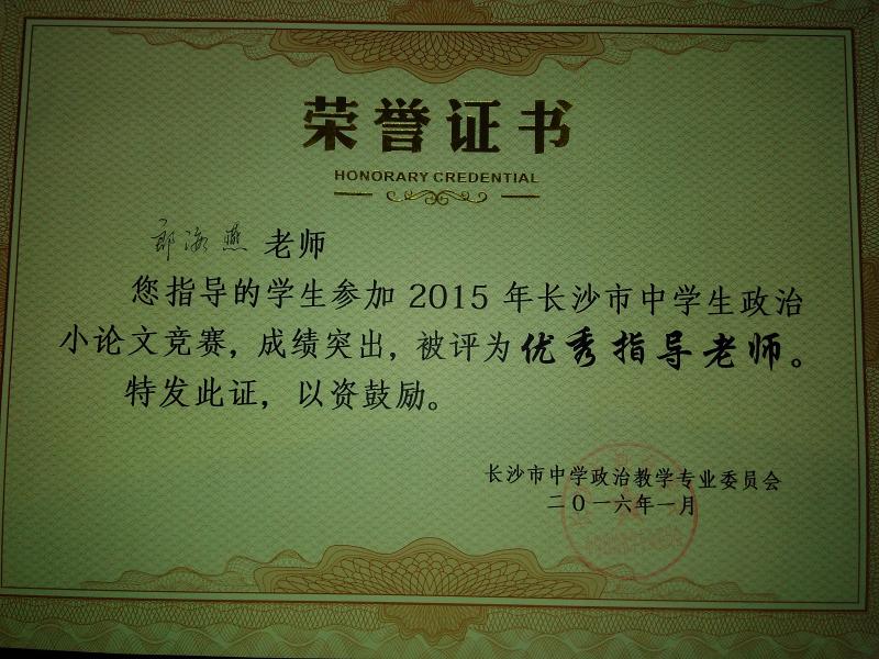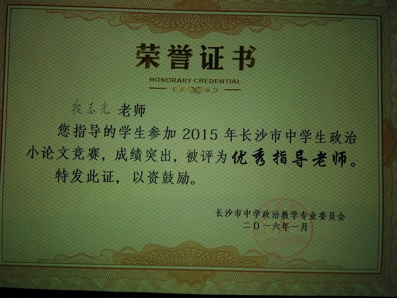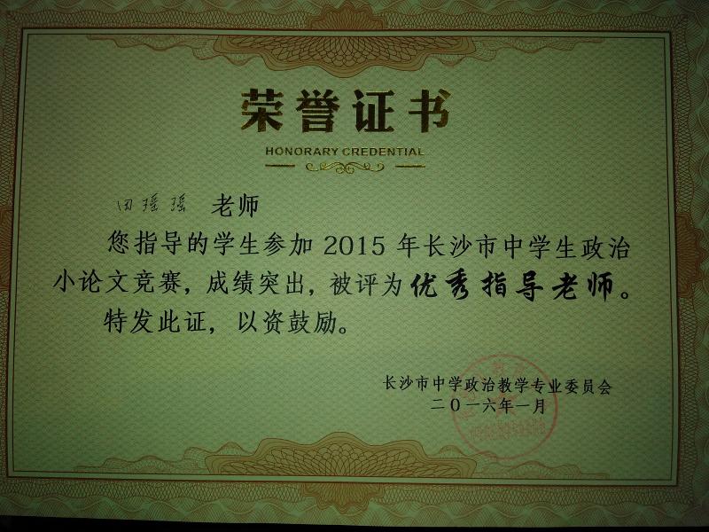 近日,政治教研组传来喜讯,我校多名学生在长沙市教育学会中学政治教学专业委员会举办的2015年度时政小论文比赛中取得好成绩:张好、周冰倩、周帅等同学荣获一等奖,列子阳、刘然等同学获二等奖,陈晴、肖雅茹等同学获三等奖。据悉,时政小论文比赛旨在引导学生关心国家大事,提升学生写作能力、分析问题和解决问题的能力。