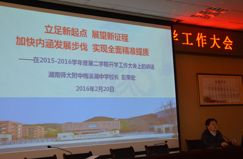 回顾过去,2015年是学校创业奠基之年。在长沙市教育局的正确领导和湖南师大附中的全力支持下,我校全体师生员工主动适应新常态,克服新困难,同舟共济,奋勇拼搏,用汗水和智慧谱写了一曲激情创业的华美乐章,取得了高起点开局的骄人成绩。彭荣宏总结了上学期的主要工作,指出学校在传承附中精神,加强领导班子建设,深化规章制度改革等12个方面取得的骄人成绩,表示学校经过一年半的艰苦创业,已实现稳健起步,各项工作已步入正轨。