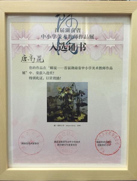 3月19日下午,由省美协、省教育学会中小学美术教学研究专业委员会、湖南美术出版社联合主办的“师说——首届湖南省中小学美术教师作品展”在美仑美术馆开幕。百余件优秀作品展出,我校两位美术教师的作品成功入选并获奖。