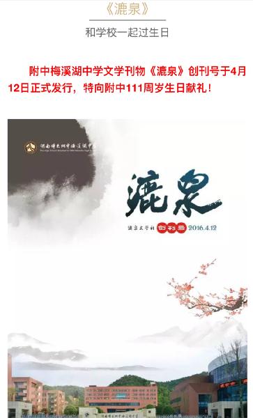 湖南师大附中111周年华诞特别节目 来源:校办 发布时间:2016-04-12 10:18:22 浏览次数: 次 【字体:小 大】 传承附中精神,担当时代使命 --纪念湖南师大附中建校111周年 张艺兴祝母校湖南师大附中111岁生日快乐 今天是我的生日 --湖南师大附中111周年华诞特别节目 分享到: 【打印正文】