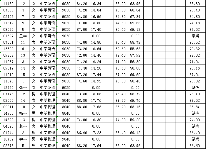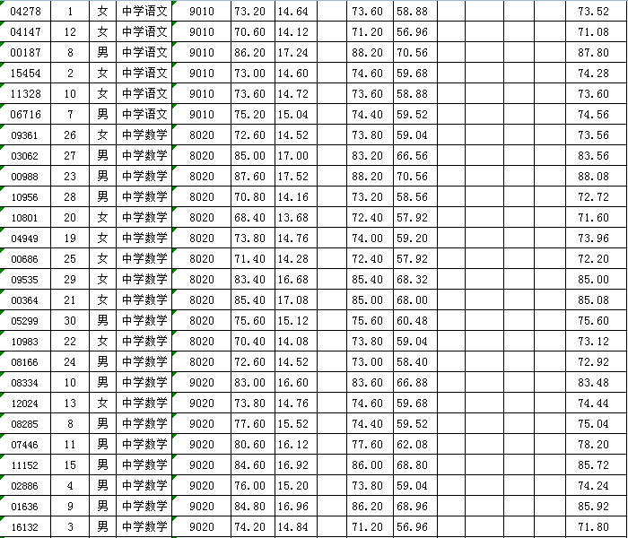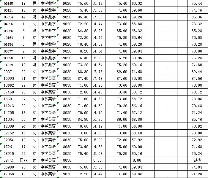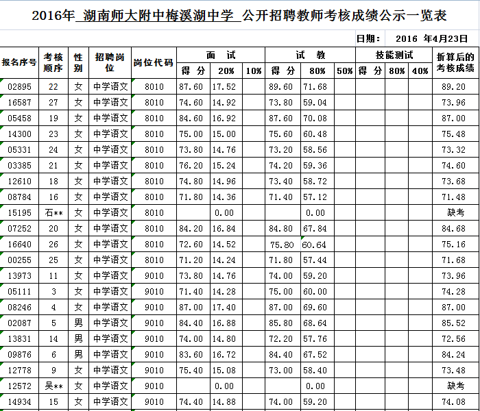 2016年聚彩彩票公开招聘教师考核成绩公示一览表(一)
