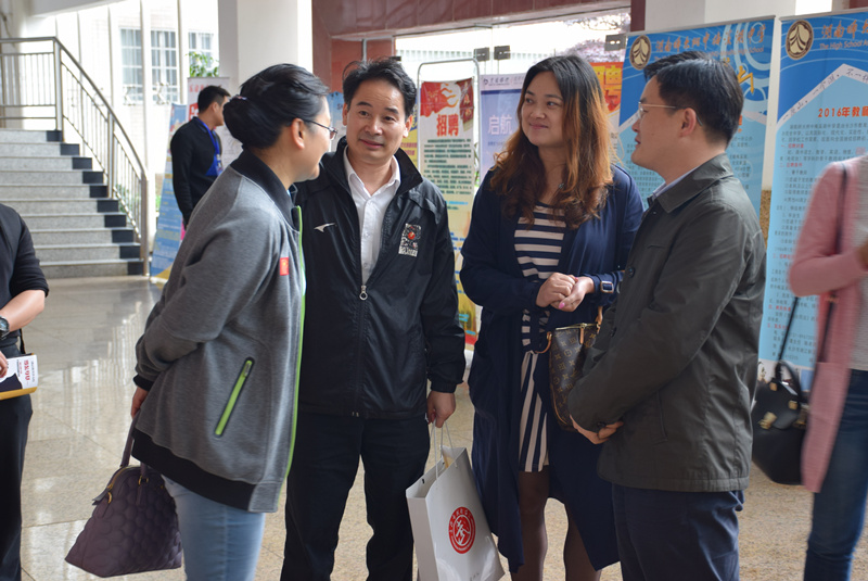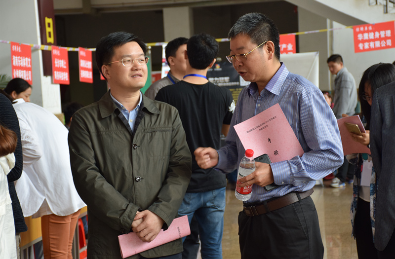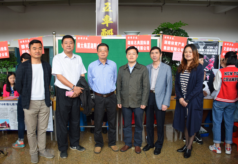 5月28日,湖南师范大学体育学院2016届毕业生招聘会在该校教学楼一楼大厅举行。我校校长彭荣宏、副校长张志、校办主任谭伟带领工作人员赴现场招贤纳士。