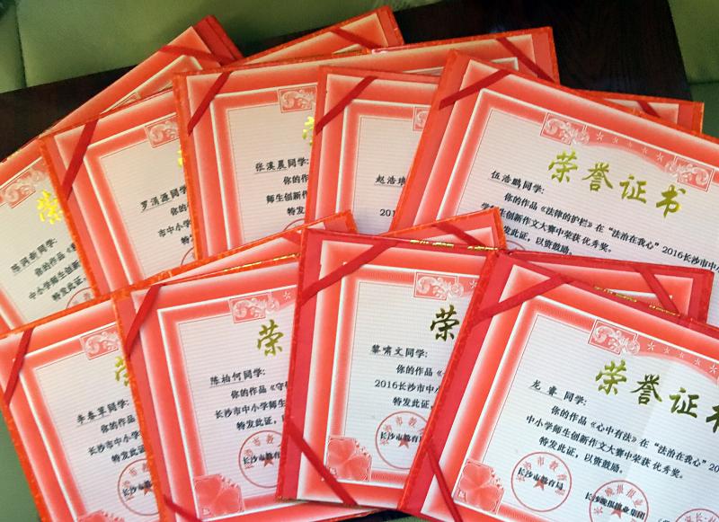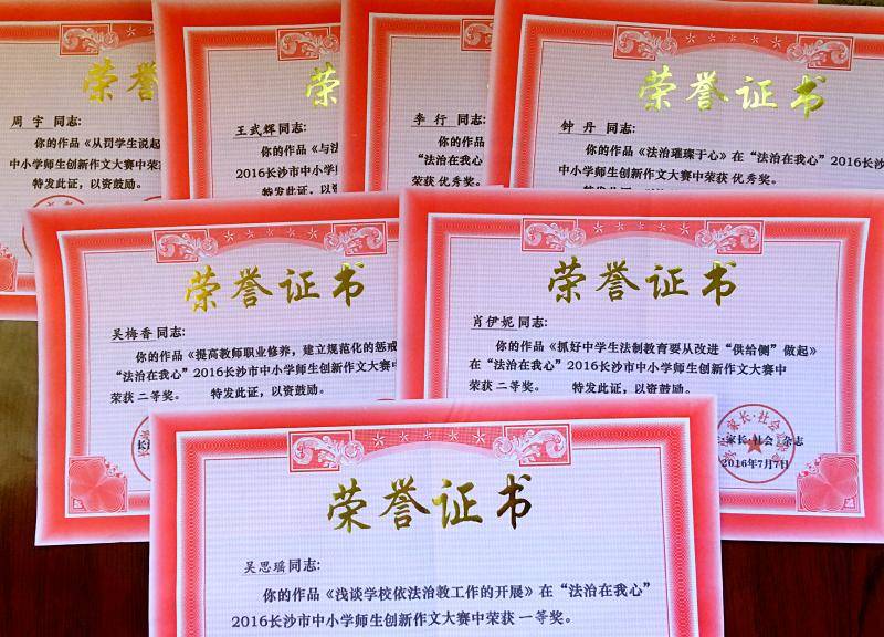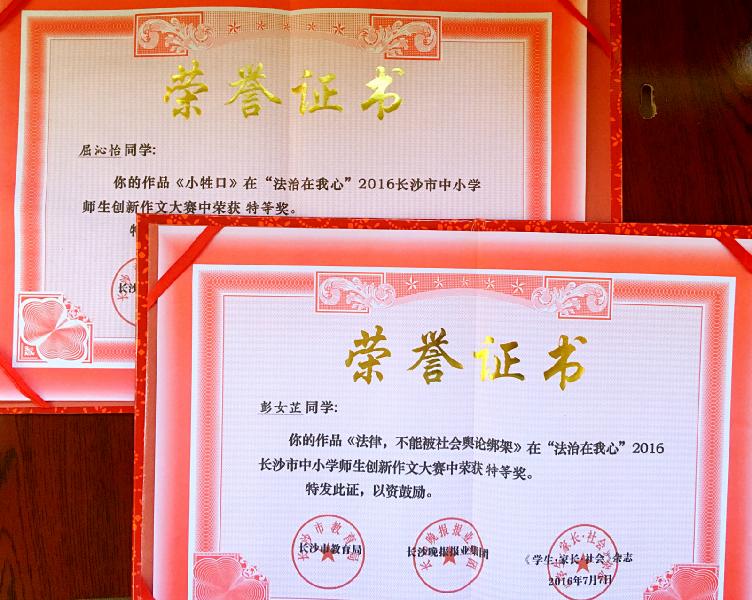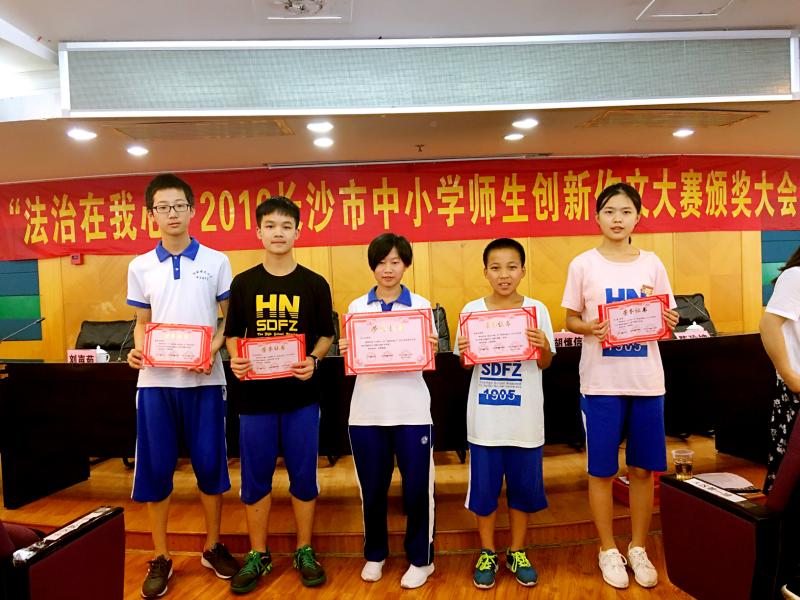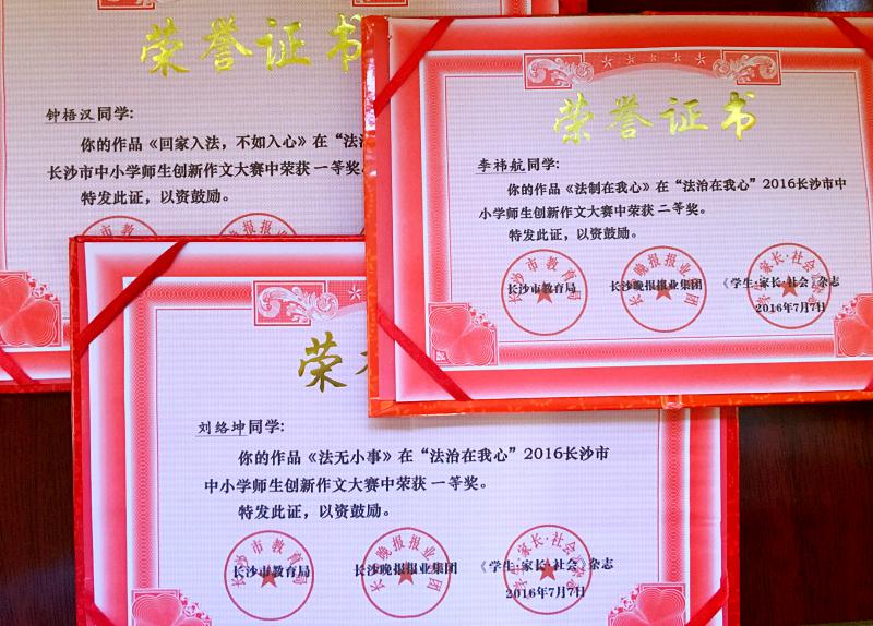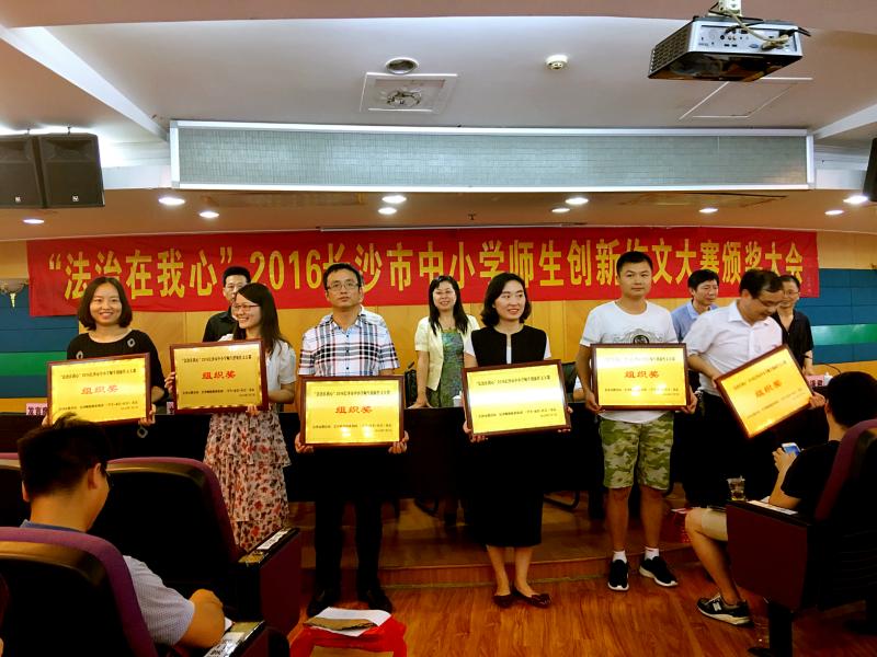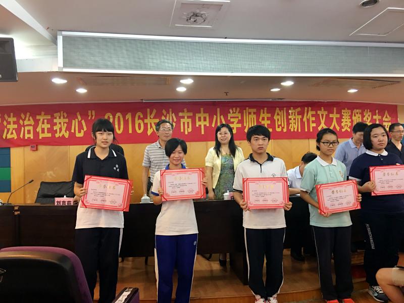 7月7日下午,长沙晚报报业集团和长沙市教育局联合发起并举办了“法治在我心”2016长沙市中小学师生创新作文大赛颁奖仪式在晚报大厦举行。经过层层筛选,我校荣获优秀组织奖,师生共荣获特等奖2名,一等奖3名,二等奖3名,优秀奖13名。其中,我校特等奖获奖者彭女芷的文章因其深刻立意受到了出席颁奖大会的长沙市教育局党委委员、机关党委书记胡慎信和长沙晚报领导的高度赞扬。