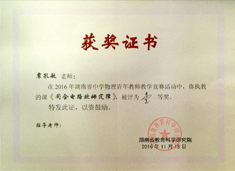 11月17日,为期两天的湖南省2016年中学物理青年教师课堂教学比赛圆满落幕。覃孔敏老师执教的《闭合电路的欧姆定律》课题,在物理教研组长谭红梅和物理老师魏晓红的悉心指导下,用实验引入,引起学生认知冲突,问题环环相扣,逻辑分明;最大的亮点是将传统实验和前沿科技传感器相结合,注重学生的科技创新。最终,覃孔敏老师凭借精心的教学设计和超群的教学艺术,一举夺得此次比赛高中组一等奖第一名。