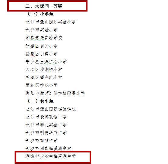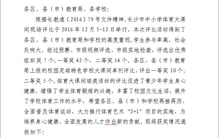 喜报:我校荣获2016年长沙市体育大课间评比一等奖 来源:学工处 发布时间:2016-12-22 09:48:39 浏览次数: 次 【字体:小 大】 12月16日,长沙市教育局公布了2016年长沙市体育大课间(球类活动)评比活动结果。经过预赛、市级视频评选、市级实地检查三个环节,我校八年级荣获初中组一等奖。 谨此,特向八年级全体师生表示祝贺!向体育组全体老师表示感谢!向全校师生报喜! 2016年长沙市体育大课间(球类活动)评比活动结果通报.doc 分享到: 【打印正文】
