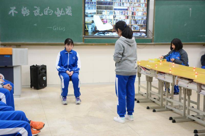 本次班会突出“青春,责任,梦想”总主题,由“不能说的秘密”串联起来,分为家庭篇和学校篇两节,展示部分为“家庭篇”。本节班会设计思路如下:第一部分是问题和矛盾引入,通过展示本班“亲子关系调查”研究结果,及青春期普遍存在的亲子关系问题引出,第二部分是再现矛盾和问题。通过一人一句吹灭蜡烛比赛的方式具体展现已搜集好的学生在家庭生活中的不满,接着通过两部家庭情景剧更加立体地重现矛盾,矛盾充分暴露才能更有针对性地解决问题。同时通过最后家长和学生内心的独白,让处于对立面的彼此开始了解对方的想法,为下一环节做铺垫。第三部分是猜“潜台词”,设置两个情境,让学生分别猜出其中标红的一句有家长言下之意的话,为进一步了解父母架一个过渡。第四部分展示家长录制的视频,与以往的“说给孩子的话”不同,这次家长主要聊自己,介绍自己的工作,生活,家庭以及现阶段面临的压力挑战与心情状态等等。平时出于对孩子的关心和爱,承担生活压力的同时,还包揽了家庭生活责任,但这一切孩子知之甚少,一方面是家长认为孩子还小,不需要过早接触,另一方面孩子自己也认为与己无关。但对父母工作生活状态的全面了解无疑会让孩子更体谅父母,懂得站在父母的角度思考问题,感受父母的成就和不易,拉进与父母的距离。第五部分是学生写下自己想对父母说的话,并选出一位现场致电父母,勇敢地将不能说的秘密说出来,沟通是理解的第一步。第六部分由班主任进行分享,谈谈与父母的沟通交流与理解,将前面同学们的酝酿的情绪置于心底。最后一部分是表演由学生自己作词的歌曲以及舞蹈献给父母,参舞人数逐步增多,以示更多的人走入理解父母的行列。班会到此结束。