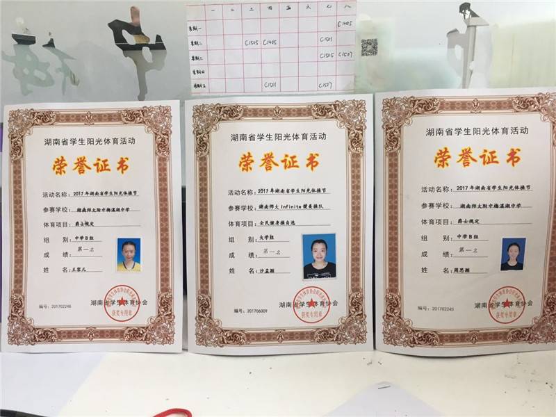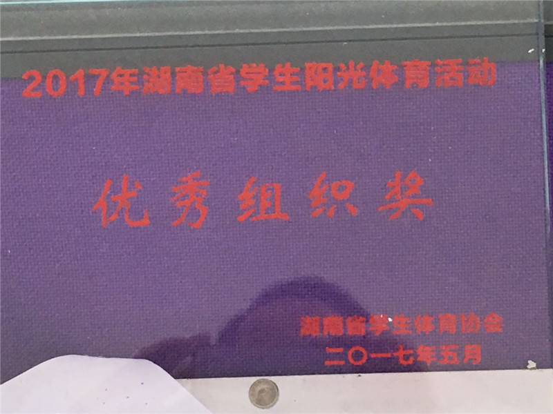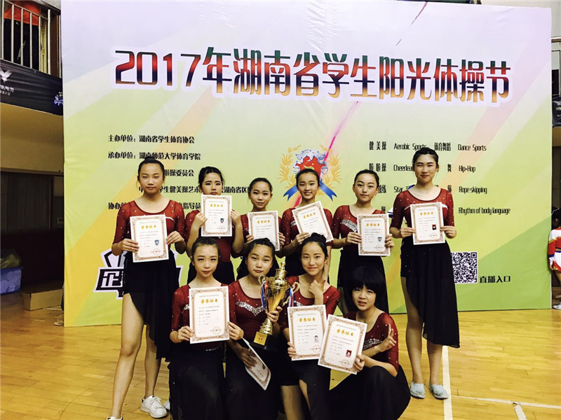 5月28日至29日,2017年湖南省学生阳光体操节在湖南师范大学体育学院举行。中学组共有30多所学校参加,我校健美操代表队不畏强手,勇夺中学组第一名,其中周思颖、王容儿同学在中学B组爵士规定项目中勇夺第一名,教练员沙孟颖在大学组全民健身操自选项目中勇夺第一名,同时我校荣获优秀组织奖。
