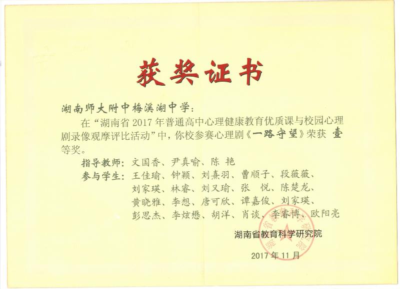 喜报:我校心理剧在2017年湖南省校园心理剧观摩比赛中荣获一等奖 来源:心理组 发布时间:2017-12-05 13:10:45 浏览次数: 次 【字体:小 大】 在刚刚落幕的湖南省2017年校园心理剧录像观摩比赛中,我校推荐作品,来自G1705班的校园心理剧《一路守望》获得湖南省一等奖,特向全校师生报喜! 信息中心副主任兼学工处副主任黄坚和电视台指导老师陈艳对学生进行指导。 拍摄现场 拍摄现场 夜景拍摄现场 分享到: 【打印正文】