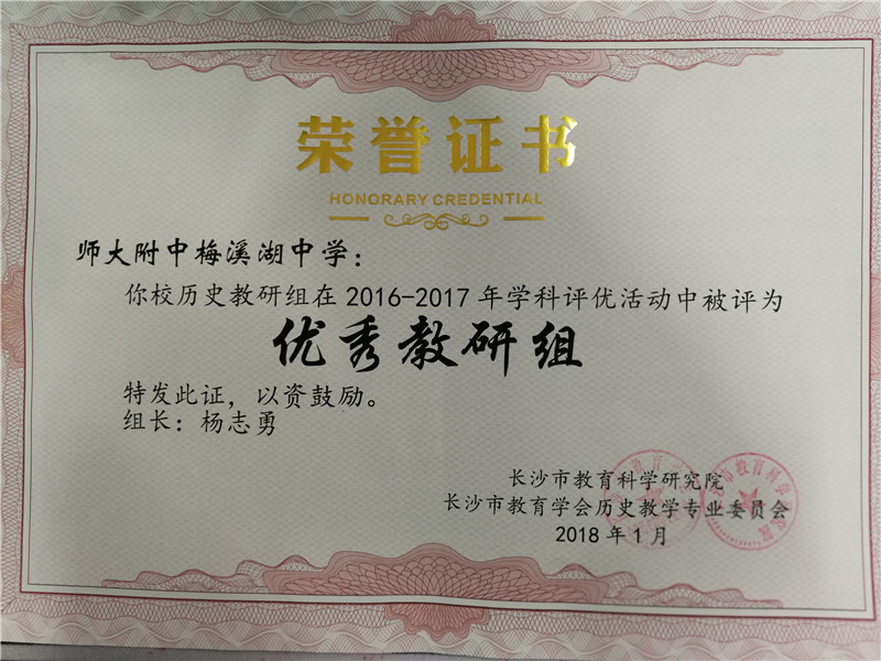 自2014年学校开办以来,历史教研组坚持“为了明天的你”的理念引领,践行“乐教善育”的教风,积极投身到教育教学教研的工作之中。目前已有多人奋战在年级组长、班主任等德育工作一线岗位上;近一年来,记录在册的外出教研活动达120以上人次,并获得了现场教学竞赛省、市级一等奖各一次,附中集团赛课一等奖一次,三十余篇论文获得省市各级奖励或发表于省级以上杂志,优质课件获得省级一等奖二次等;此外,历史教研组还认真落实集体备课制度,坚持每周进行青年教师组内教研课,注重对青年教师的打造,取得了不俗的成绩。此次荣誉的获得,正是上级领导部门对历史教研组工作的肯定和支持,也必将是历史教研组继续砥砺前行的动力。