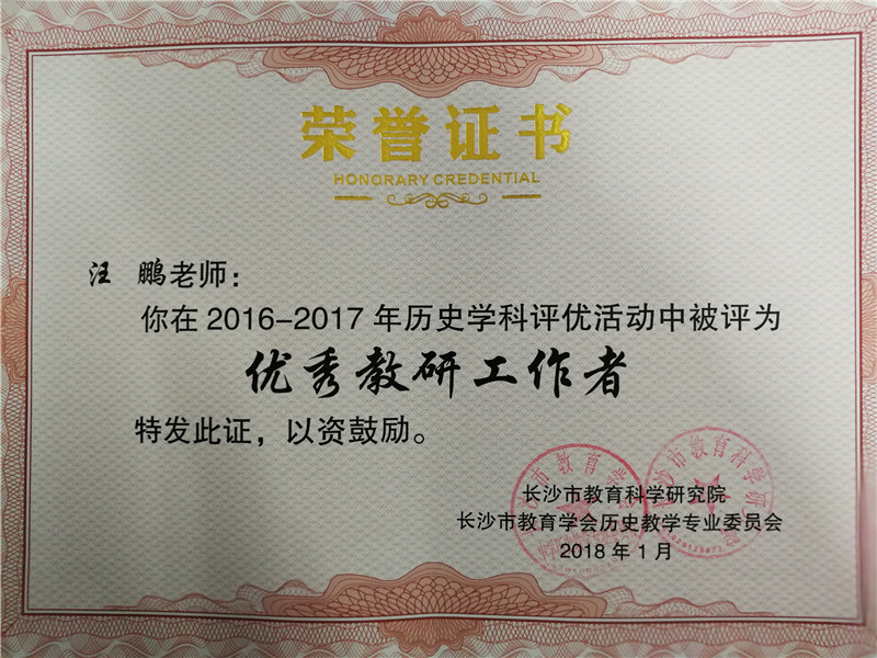 1月23日,经长沙市教育科学研究院和长沙市中学历史教学专业委员会评选,我校历史教研组荣获“长沙市优秀教研组”称号,历史教研组汪鹏老师获评“长沙市优秀教研工作者”称号。