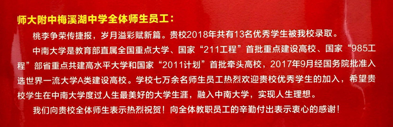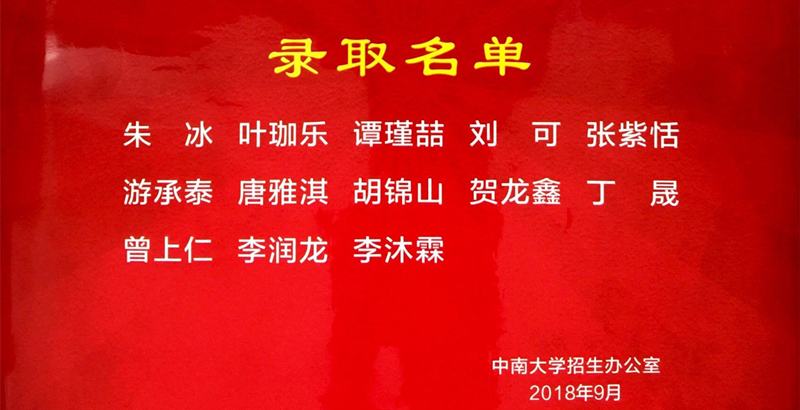 【喜报】我校13名优秀毕业生被中南大学录取 来源:校办 发布时间:2018-10-16 11:32:04 浏览次数: 次 【字体:小 大】 近日,我校收到中南大学2018年录取喜报。朱冰、叶珈乐、谭瑾喆等13名优秀毕业生被中南大学录取,他们将在中南大学度过人生中最美好的大学生涯,融入中南大学,实现人生理想! 谨此,向13名优秀毕业生表示热烈祝贺!向辛勤培育优秀毕业生的老师表示诚挚感谢!希望进入中南大学的优秀学子继续努力,传承附梅人的精神,融入中南人的文化,铸就自我辉煌,为母校争光,为新校添彩! 分享到: 【打印正文】