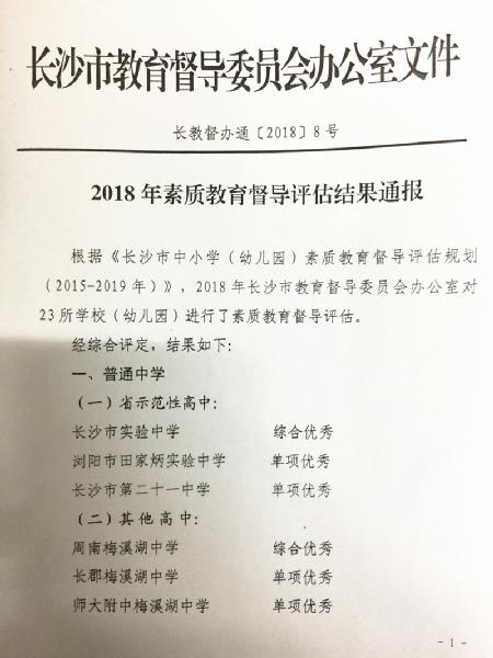 喜报:我校被评为2018年长沙市素质教育督导评估单项优秀 来源:校办 发布时间:2019-01-04 12:00:52 浏览次数: 次 【字体:小 大】 近日,根据长沙市教育督导委员会办公室文件发布的《2018年素质教育督导评估结果通报》获悉,我校被评为2018年长沙市素质教育督导评估单项优秀,结果通报如下: 分享到: 【打印正文】