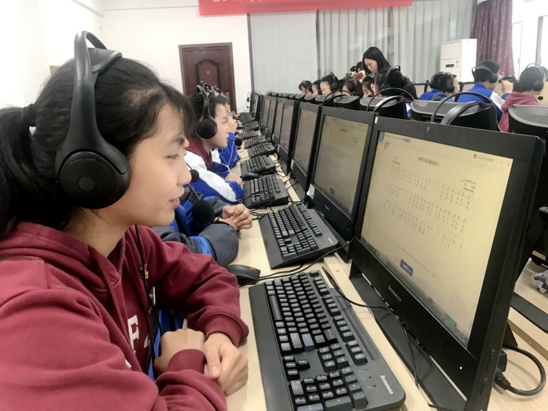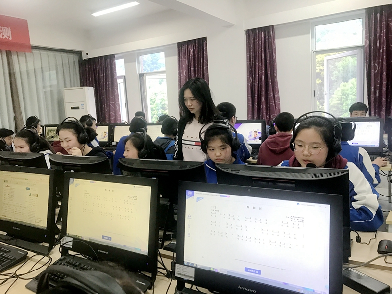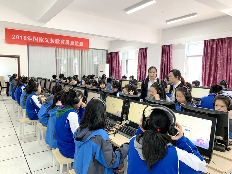 在课间操时间,八年级学生在班主任的带领下来到机房进行测试,测试工作有条不紊的开展。