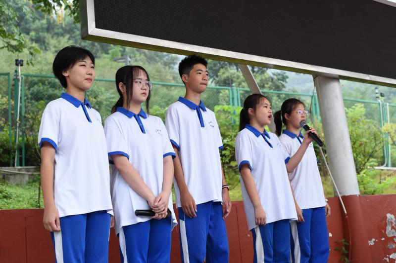 典礼中,八年级同学带来朗诵《我的祖国》,校合唱队齐声领唱歌曲《我爱你中国》。