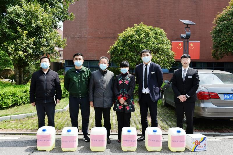 4月1日下午,湖南华洋世纪汽车集团有限公司也向我校捐赠医用84消毒液和部分其他物资。