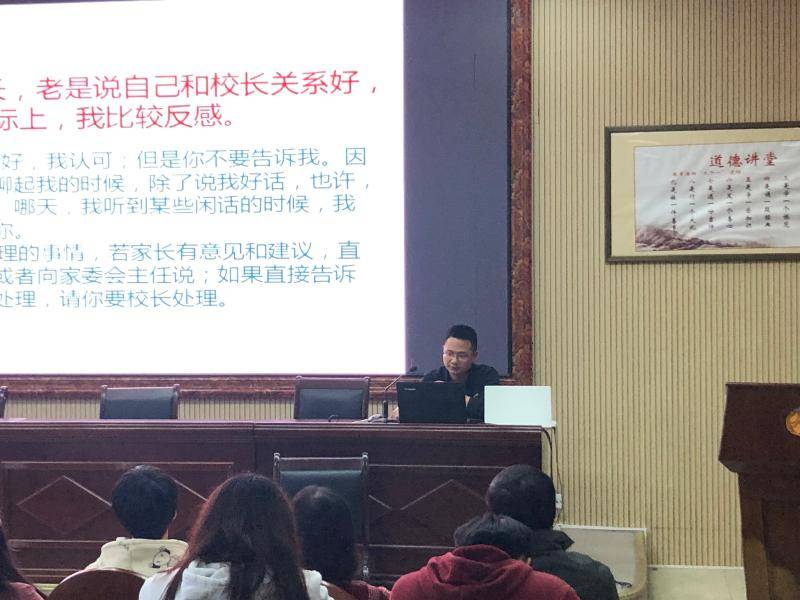班主任是“最小的主任”,却承担着极大的责任。班主任工作是学校教育教学工作的灵魂,是学校德育工作的重中之重。为进一步强化班级管理,提高班主任的工作艺术水平和管理层次,探索班主任工作经验,创新班级管理的新方法、新思路,促进班主任间的交流与合作,10月19日下午,学校“漉泉心语”班主任论坛活动在教学楼三楼道德讲堂举行。全校班主任参加了活动。副校长张志出席活动。论坛由学工处主任王超主持,本次活动特邀各年级段优秀班主任进行经验分享报告。