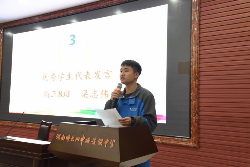 G1808同学梁志伟作为优秀学生的代表,在台上发言。他向所有同学分享了自己一直坚定前行的原因,就是“成为一个有思想的人”:一个有思想的人,才能认识自我并拥有理想;一个有思想的人,才能独立思考并敢于质疑;一个有思想的人,才能勇于直面挫折,一往无前!他最后作结:“不要停止奔跑,不要回顾来路!来路无可眷恋,值得期待的只有前方!”这不正是师梅高三全体师生所一直秉承的信念吗?