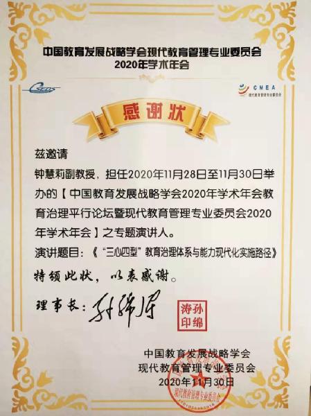 11月28-30日,中国教育发展战略学会2020学术年会,教育治理平行论坛暨现代教育管理专业委员会2020年学术年会在北京召开。全国基础教育、职业教育、高等教育、终身学习领域研究学者和专家参加会议。我校党委书记钟慧莉作为中学的唯一分享代表在会上发言,推介学校。