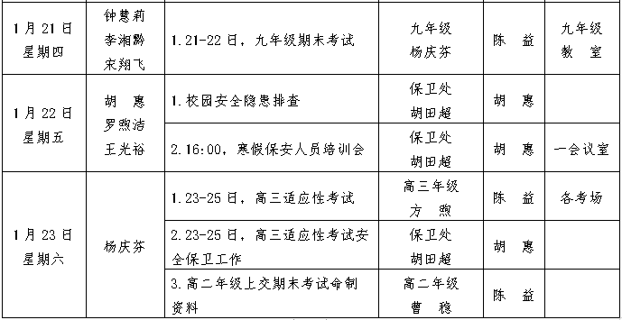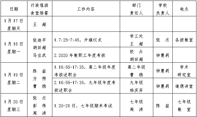 第21周工作安排:2021年1月17-23日 来源:校办 发布时间:2021-01-19 17:19:18 浏览次数: 次 【字体:小 大】 聚彩彩票2020-2021学年度第一学期 第21周工作安排表 (2021年1月17-23日) 校办公室 2021年1月17日 分享到: 【打印正文】